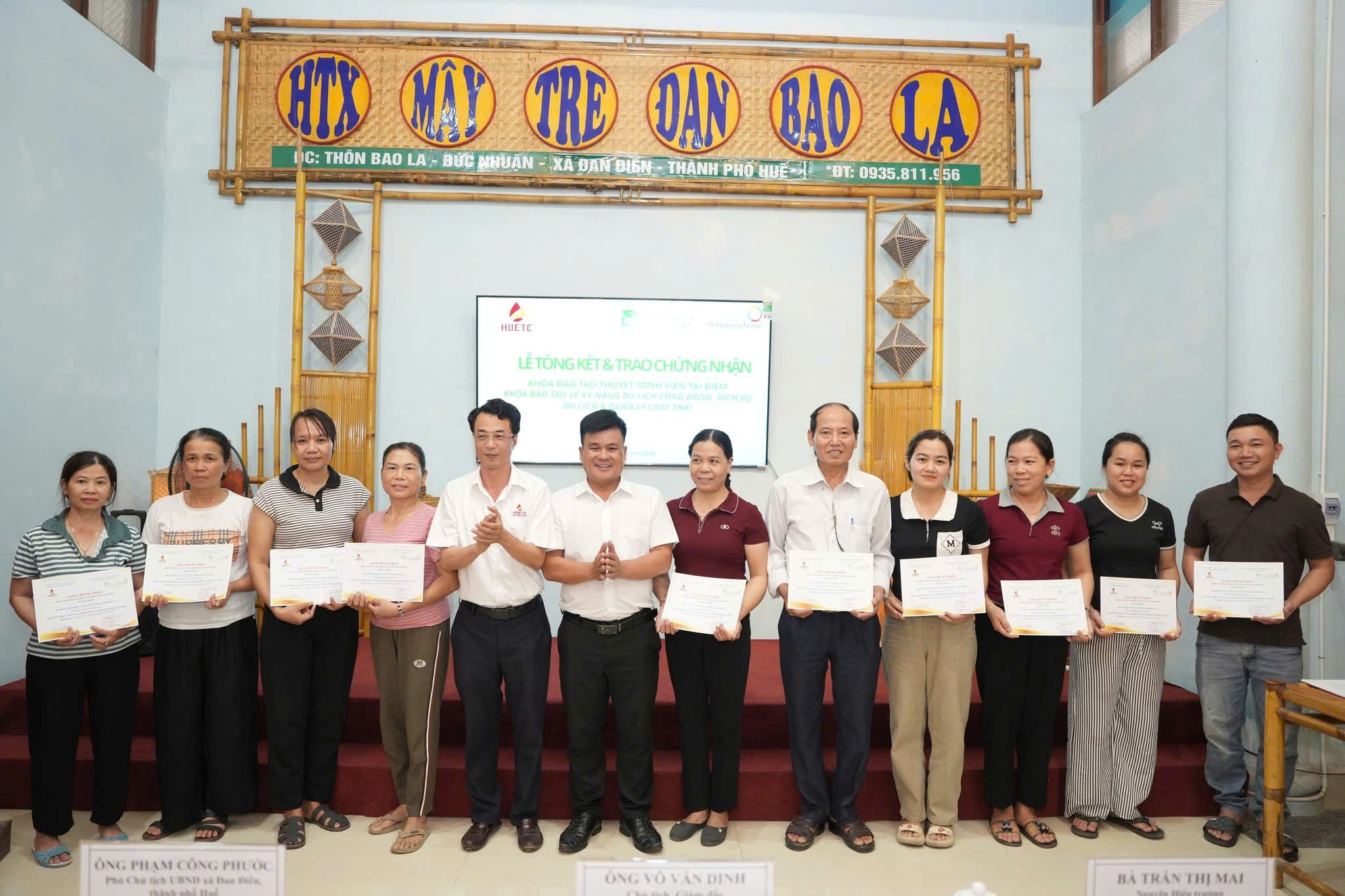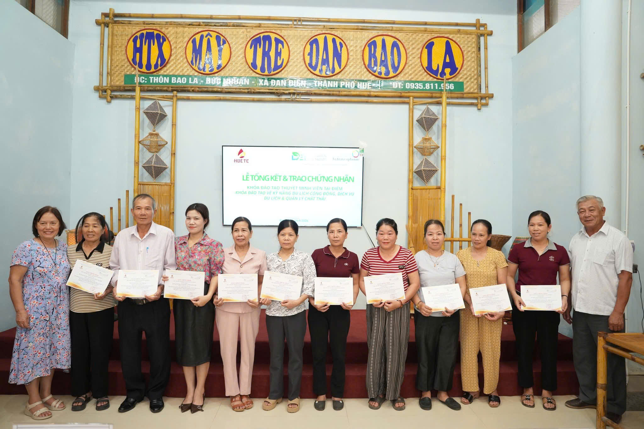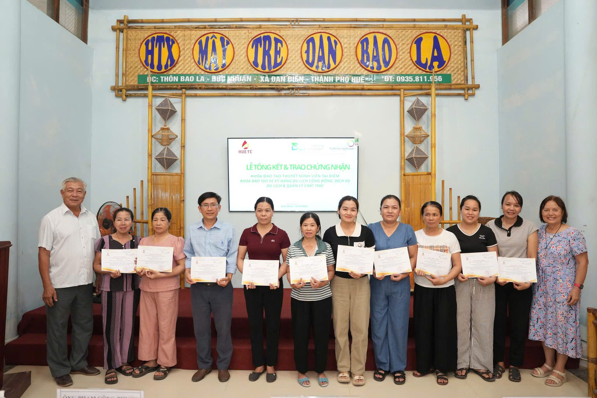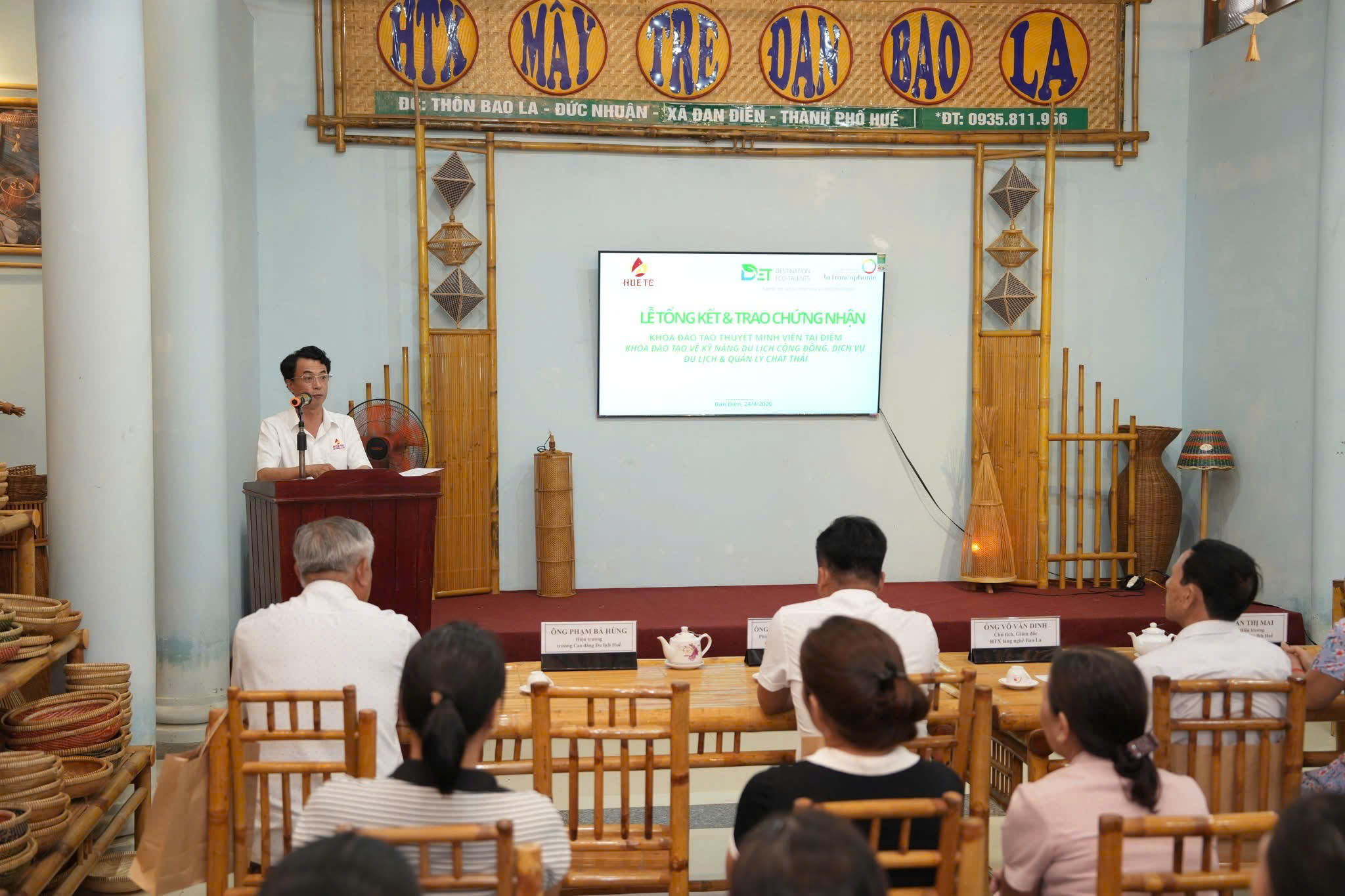 Chiều ngày 24/4/2026, tại Hợp tác xã Mây tre đan Bao La (xã Đan Điền, TP. Huế), Trường Cao đẳng Du lịch Huế đã long trọng tổ chức Lễ bế giảng khóa đào tạo thuyết minh viên tại điểm và khóa đào tạo kỹ năng du lịch cộng đồng, dịch vụ du lịch và quản lý chất thải.