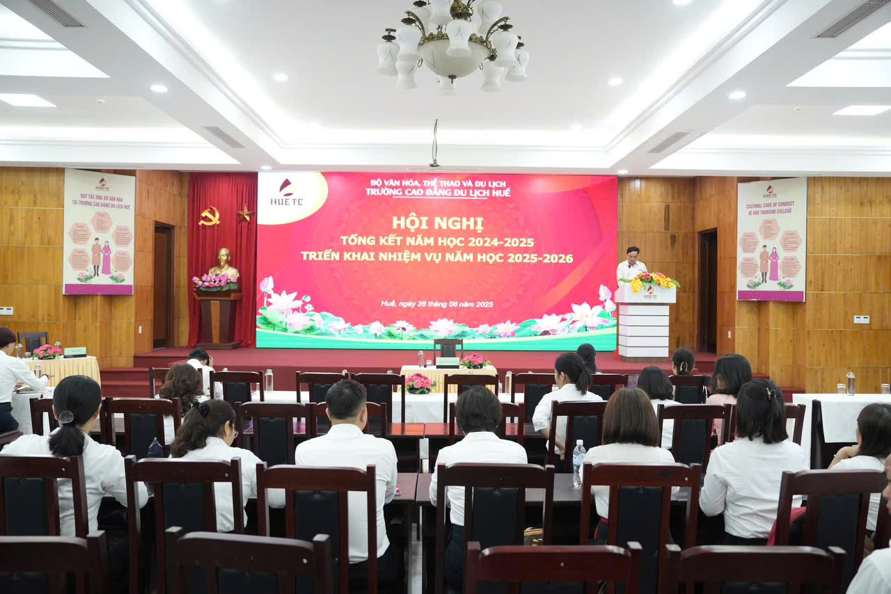 Hội nghị tổng kết năm học 2024–2025 và triển khai nhiệm vụ năm học 2025–2026 đã diễn ra nghiêm túc, hiệu quả, khẳng định quyết tâm đổi mới và phát triển toàn diện của Nhà trường. Với những thành quả đạt được và định hướng rõ ràng cho năm học mới, Trường Cao đẳng Du lịch Huế tiếp tục khẳng định vị thế là cơ sở đào tạo nghề uy tín, đáp ứng yêu cầu nguồn nhân lực chất lượng cao trong thời kỳ hội nhập và chuyển đổi số, đồng thời phát huy tinh thần đoàn kết, sáng tạo để xây dựng Nhà trường ngày càng vững mạnh và bền vững./.