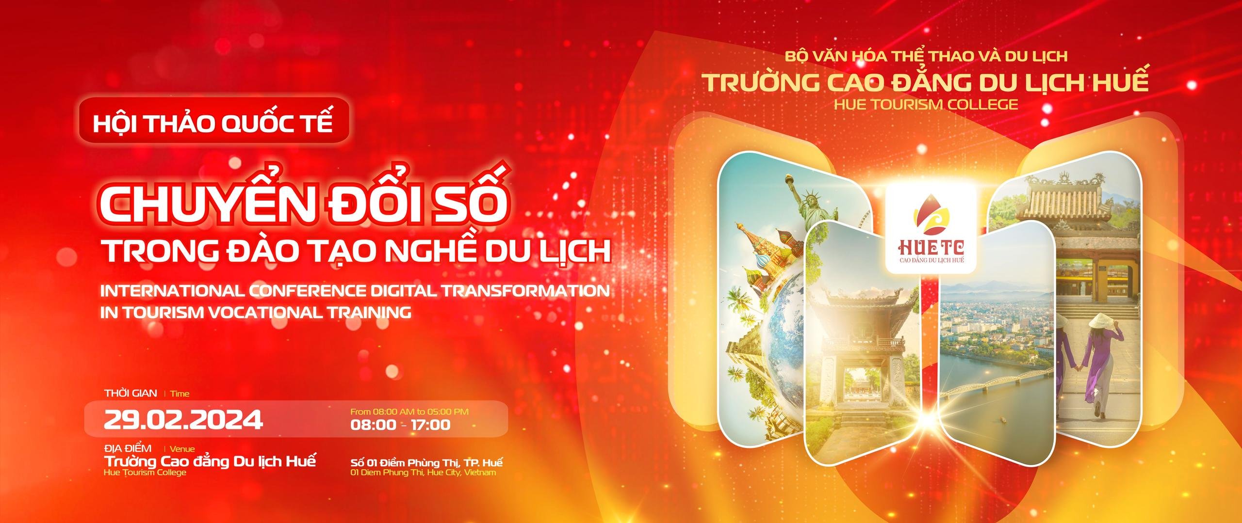 Bộ Văn hóa, Thể thao và Du lich đã có Quyết định 219/QĐ-BVHTTDL về việc tổ chức Hội thảo quốc tế về chuyển đổi số trong đào tạo nghề du lịch. Theo quyết định, Bộ cho phép Trường Cao đẳng Du lịch Huế tổ chức Hội thảo quốc tế về chuyển đổi số trong đào tạo nghề du lịch. Hội thảo diễn ra trong thời gian 01 ngày: Từ 08h00 – 17h00 ngày 29/2/2024 tại Trường Cao đẳng Du lịch Huế, số 01 Điềm Phùng Thị, thành phố Huế, tỉnh Thừa Thiên Huế. Hội thảo dự kiến có 100 đại biểu tham gia bao gồm đại diện Bộ Lao động – Thương binh và Xã Hội; đại diện một số đơn vị trực thuộc Bộ Văn hóa, Thể thao và Du lịch; đại diện một số Sở ban ngành, Viện nghiên cứu, Hiệp hội, Liên hiệp hội, cơ sở giáo dục nghề nghiệp, doanh nghiệp du lịch… trên địa bàn tỉnh Thừa Thiên Huế; đại diện các trường đào tạo nghề du lịch của Thụy Sĩ, Pháp, Úc, Hàn Quốc và Thái Lan là đối tác nước ngoài: Trường École Hôtelière de Lausanne (EHL), Học viện William Angliss Institute và Học viện Chisholm, Trường Đại học Jeonju, Viện Mekong …. Hội thảo sử dụng ngôn ngữ: Tiếng Anh và Tiếng Việt.